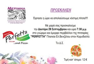 ΔΕΥΤΕΡΑ 29 Σεπτεμβρίου 2025 & ώρα 7:30 μ.μ. Σας περιμένουμε για να απολαύσουμε εξαιρετική πίτσα στην Πιτσαρία “PERFETTA” - Πλ ...